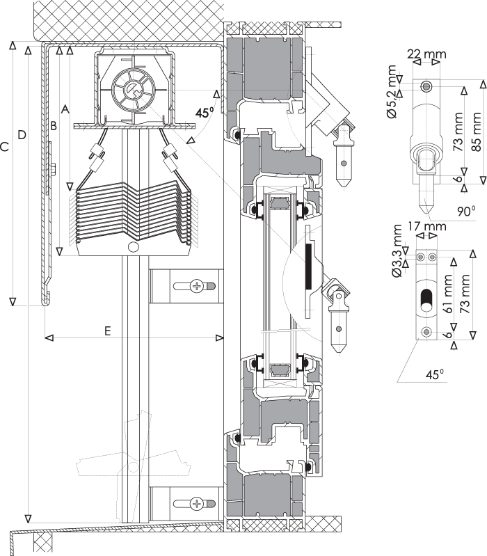 horní profil - 56 x 58 mm z pozinkovaného ocelového plechu nebo z extrudovaného hliníku